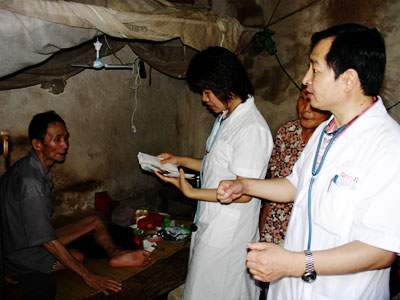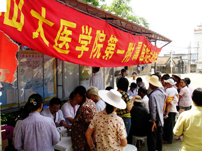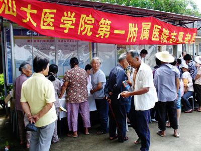 醫(yī)生們在快速的準(zhǔn)備之后,馬上開始了忙碌的工作,為村民義務(wù)看病??赐瓴〉拇迕癖甲呦喔?,看病的人流絡(luò)繹不絕,醫(yī)生們忙個不停,汗流浹背。許多看完病的老人都很高興,連聲說好,村支書戴昭金更是動情地說,該村歷次送醫(yī)下鄉(xiāng)活動中,此次最為踴躍。有個別行走不便不能來看病的,內(nèi)科的許錫振博士和團委楊秀珣書記還不辭辛苦地到75歲村民陳長腳家中為其診病。由于看病的人一直很多,活動持續(xù)到中午,醫(yī)生們顧不上吃飯,一直忙到看完最后一個病人。