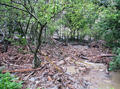 (洪水漫堤,淹過河邊的樹林)