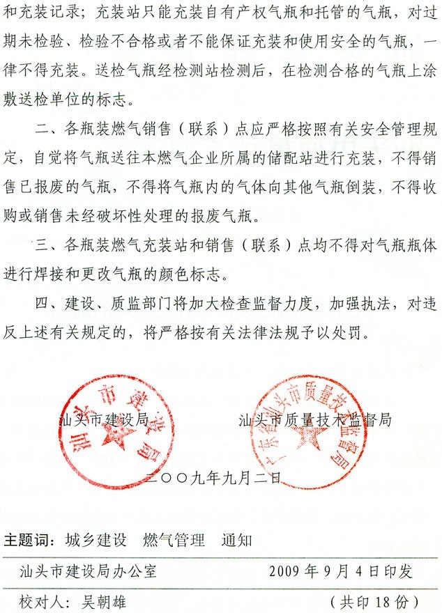 關(guān)于加強瓶裝燃?xì)庹军c管理的通知汕府建[2009]143號