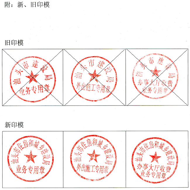 根據(jù)中共汕頭市委、汕頭市人民政府《關(guān)于印發(fā)〈汕頭市人民政府機(jī)構(gòu)改革方案〉的通知》(汕發(fā)〔2009〕14號(hào))精神,我市組建汕頭市住房和城鄉(xiāng)建設(shè)局。我局駐市行政服務(wù)中心窗口的相關(guān)新印章“汕頭市住房和城鄉(xiāng)建設(shè)局業(yè)務(wù)專用章”、“汕頭市住房和城鄉(xiāng)建設(shè)局外出施工專用章”、“汕頭市住房和城鄉(xiāng)建設(shè)局辦事大廳收費(fèi)業(yè)務(wù)專用章”,從即日起啟用,舊業(yè)務(wù)印章同時(shí)停用。