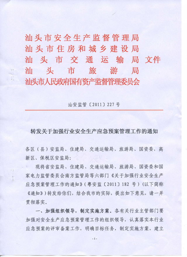 轉(zhuǎn)發(fā)關(guān)于加強行業(yè)安全生產(chǎn)應(yīng)急預(yù)案管理工作的通知汕安監(jiān)管[2011]227號