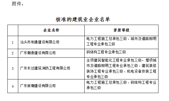 根據(jù)《中華人民共和國(guó)行政許可法》、《中華人民共和國(guó)建筑法》和有關(guān)建設(shè)工程企業(yè)資質(zhì)管理規(guī)定,現(xiàn)將經(jīng)我局審查核準(zhǔn)的建筑業(yè)企業(yè)名單予以公布(見附件)。