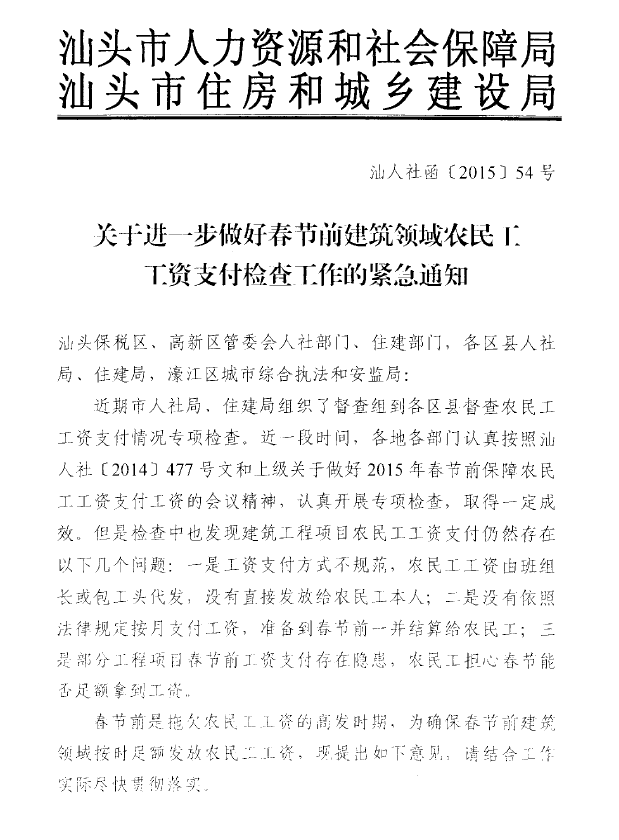 關(guān)于進(jìn)一步做好春節(jié)前建筑領(lǐng)域農(nóng)民工工資支付檢查工作的緊急通知