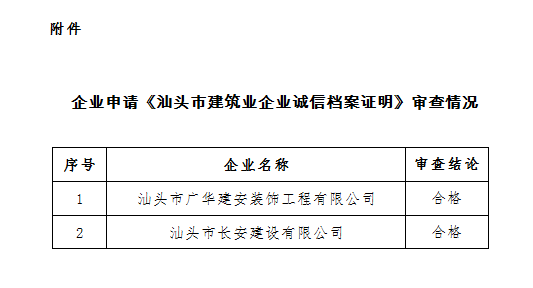 根據(jù)《關(guān)于實(shí)施施工企業(yè)誠信綜合評(píng)價(jià)制度的通知(試行)》(汕府建通〔2012〕29號(hào))和《關(guān)于完善施工企業(yè)誠信檔案登記有關(guān)問題的通知》(汕府建通〔2012〕236號(hào))精神,我局組織對(duì)汕頭市廣華建安裝飾工程有限公司和汕頭市長安建設(shè)有限公司申請(qǐng)《汕頭市建筑業(yè)企業(yè)誠信檔案證明》情況進(jìn)行了審查,現(xiàn)將審查情況予以公布。