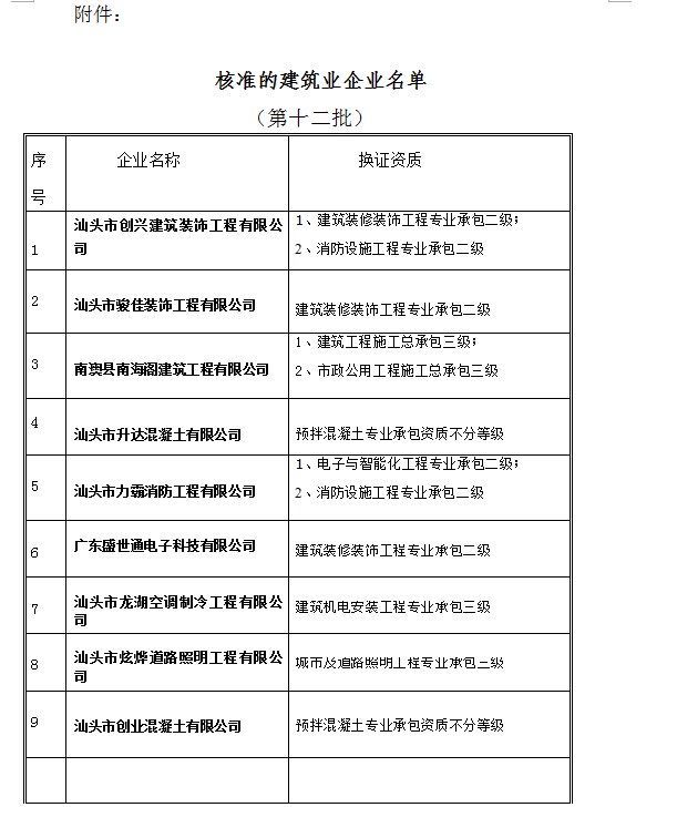 按照《廣東省住房和城鄉(xiāng)建設(shè)廳關(guān)于開展我省建筑業(yè)企業(yè)資質(zhì)簡單換證工作的通知》(粵建許函[2015]2331號)的規(guī)定,現(xiàn)將經(jīng)我局核準(zhǔn)換證的汕頭市創(chuàng)興建筑裝飾工程有限公司等9家企業(yè)名單予以公布(見附件)。