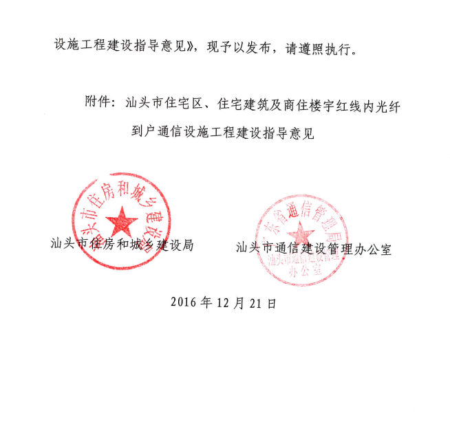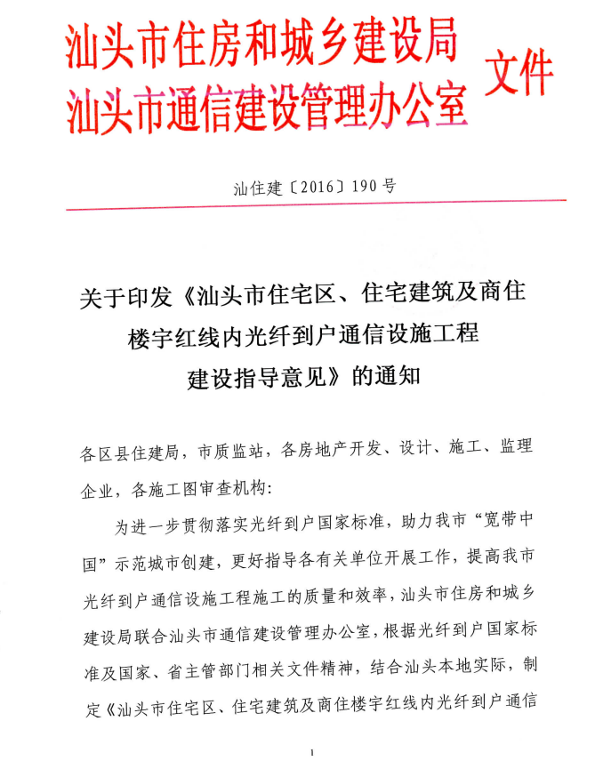關(guān)于印發(fā)《汕頭市住宅區(qū)、住宅建筑及商住樓宇紅線內(nèi)光纖到戶通信設(shè)施工程建設(shè)指導(dǎo)意見》的通知汕住建[2016]190號