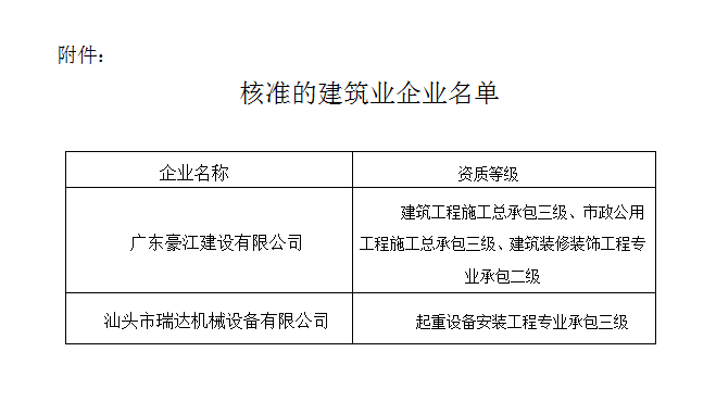 根據(jù)《中華人民共和國(guó)行政許可法》、《中華人民共和國(guó)建筑法》和有關(guān)建設(shè)工程企業(yè)資質(zhì)管理規(guī)定,現(xiàn)將經(jīng)我局審查核準(zhǔn)的建筑業(yè)企業(yè)名單予以公布(見附件)。