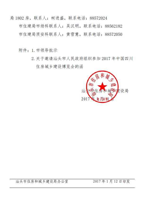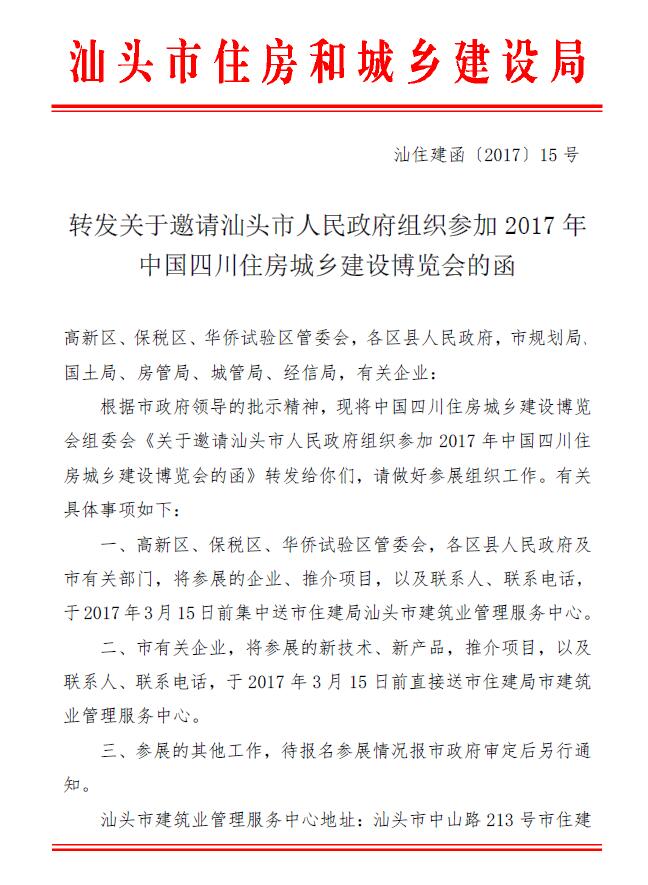轉發(fā)關于邀請汕頭市人民政府組織參加 2017 年中國四川住房城鄉(xiāng)建設博覽會的函汕住建函〔2017〕15 號