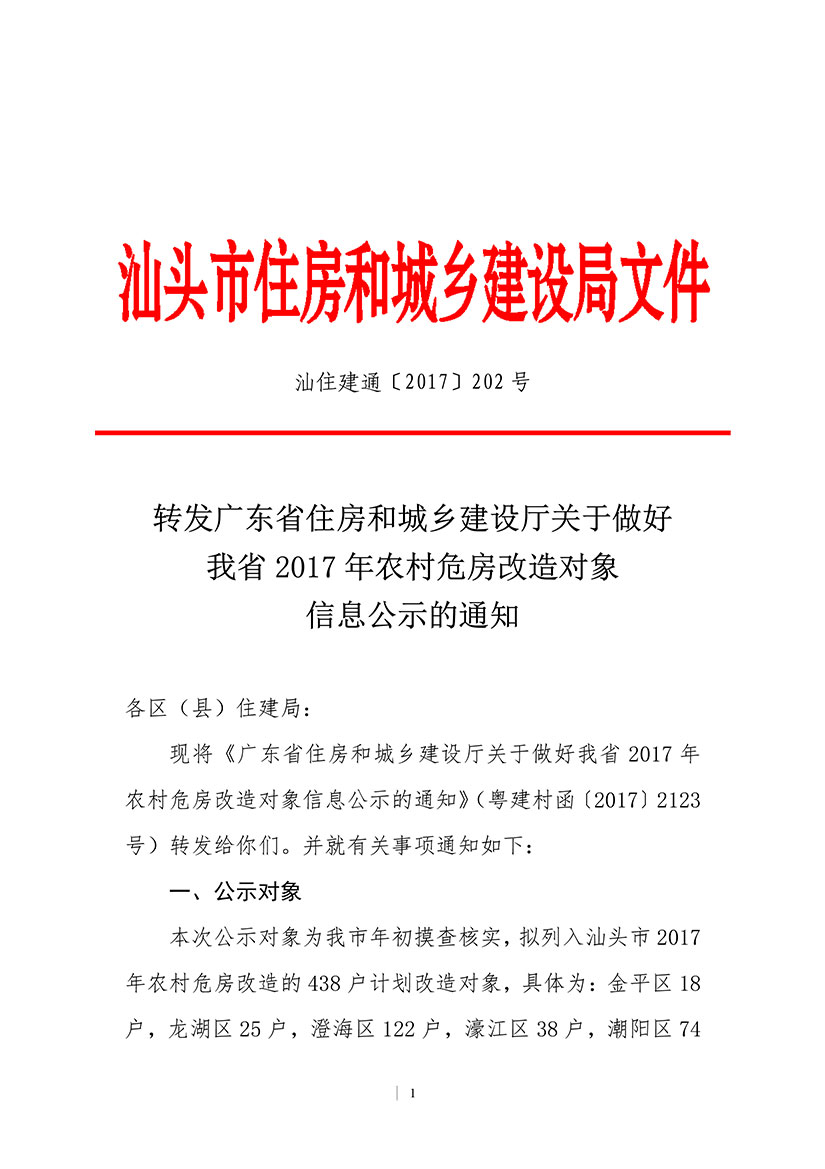 轉(zhuǎn)發(fā)省住建廳關于做好2017年農(nóng)村危房改造對象信息公示的通知汕住建通【2017】202號