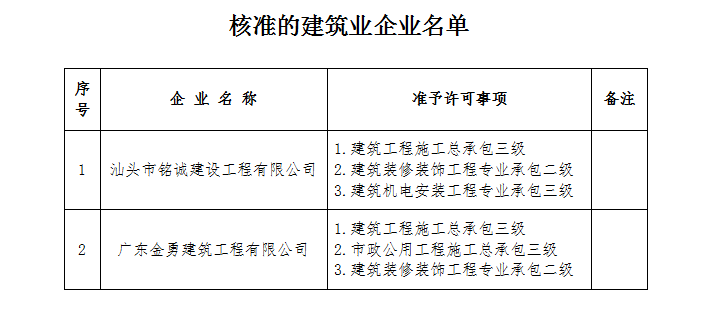 根據(jù)《中華人民共和國行政許可法》、《中華人民共和國建筑法》和有關(guān)建設工程企業(yè)資質(zhì)管理規(guī)定,現(xiàn)將經(jīng)我局審查核準的汕頭市銘誠建設工程有限公司等2家建筑業(yè)企業(yè)名單予以公布(見附表)。