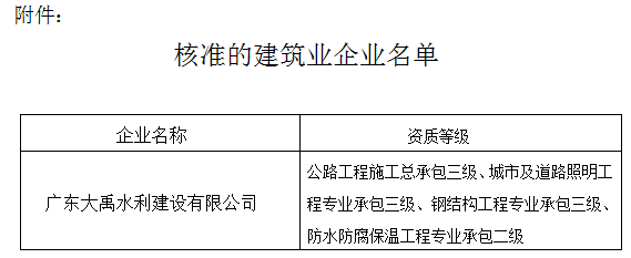 根據(jù)《中華人民共和國行政許可法》、《中華人民共和國建筑法》和有關(guān)建設(shè)工程企業(yè)資質(zhì)管理規(guī)定,現(xiàn)將經(jīng)我局審查核準(zhǔn)的建筑業(yè)企業(yè)名單予以公布(見附件)。