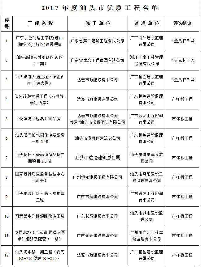 2017年度汕頭市優(yōu)質(zhì)工程評(píng)選結(jié)果公示汕住建公示〔2018〕14號(hào)