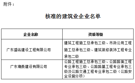 瀏覽次數(shù):4376根據(jù)《中華人民共和國行政許可法》、《中華人民共和國建筑法》和有關(guān)建設(shè)工程企業(yè)資質(zhì)管理規(guī)定,現(xiàn)將經(jīng)我局審查核準(zhǔn)的廣東盛名建設(shè)工程有限公司等二家建筑業(yè)企業(yè)名單予以公布(見附件)。