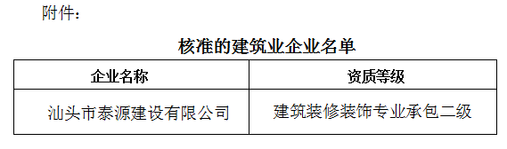 關(guān)于建筑業(yè)企業(yè)資質(zhì)核準(zhǔn)結(jié)果的公告汕住建公告〔2018〕15號(hào)