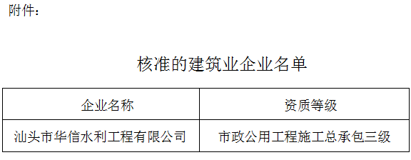 根據(jù)《中華人民共和國行政許可法》、《中華人民共和國建筑法》和有關(guān)建設(shè)工程企業(yè)資質(zhì)管理規(guī)定,現(xiàn)將經(jīng)我局審查核準的汕頭市華信水利工程有限公司予以公布(見附件)。