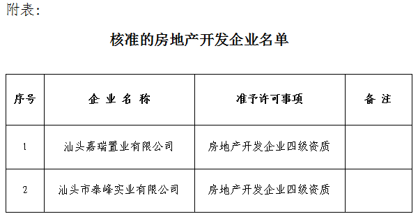 根據(jù)《中華人民共和國行政許可法》、《中華人民共和國城市房地產(chǎn)管理法》和有關房地產(chǎn)開發(fā)企業(yè)資質管理規(guī)定,現(xiàn)將經(jīng)我局審查核準的汕頭嘉瑞置業(yè)有限公司等2家房地產(chǎn)開發(fā)企業(yè)名單予以公布(見附表)。