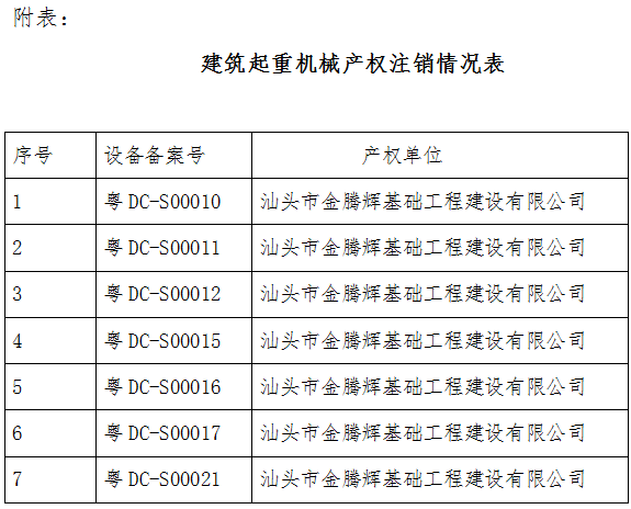 依據《建筑機械備案登記辦法》管理規(guī)定,我局對下列7臺建筑起重機械設備現已辦理產權注銷手續(xù)(詳見附表)。