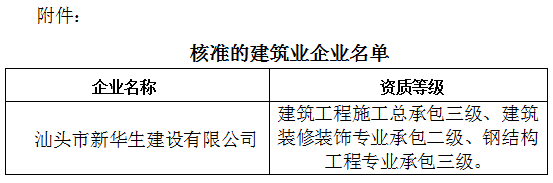 根據(jù)《中華人民共和國(guó)行政許可法》、《中華人民共和國(guó)建筑法》和有關(guān)建設(shè)工程企業(yè)資質(zhì)管理規(guī)定,現(xiàn)將經(jīng)我局審查核準(zhǔn)的建筑業(yè)企業(yè)名單予以公布(見附件)。