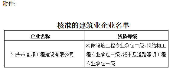關(guān)于建筑業(yè)企業(yè)資質(zhì)核準(zhǔn)結(jié)果的公告汕住建公告〔2018〕34號(hào)
