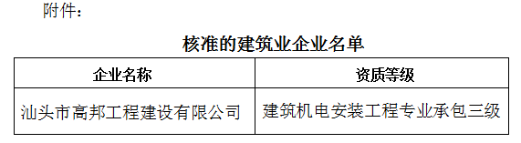 關(guān)于建筑業(yè)企業(yè)資質(zhì)核準(zhǔn)結(jié)果的公告汕住建公告〔2018〕47號(hào)