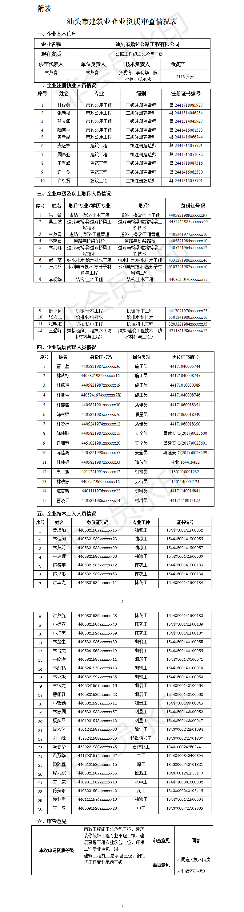 瀏覽次數(shù):4406按照《中華人民共和國(guó)行政許可法》規(guī)定以及《建筑業(yè)企業(yè)資質(zhì)管理規(guī)定》(住房城鄉(xiāng)建設(shè)部第22號(hào)令)、(住房城鄉(xiāng)建設(shè)部關(guān)于印發(fā)《建筑業(yè)企業(yè)資質(zhì)標(biāo)準(zhǔn)》的通知)(建市[2014]159號(hào))的要求,我局對(duì)近期申請(qǐng)建筑業(yè)企業(yè)資質(zhì)的汕頭市晟達(dá)公路工程有限公司的申報(bào)材料進(jìn)行了審查,現(xiàn)將審查意見予以公示 (見附表) 。