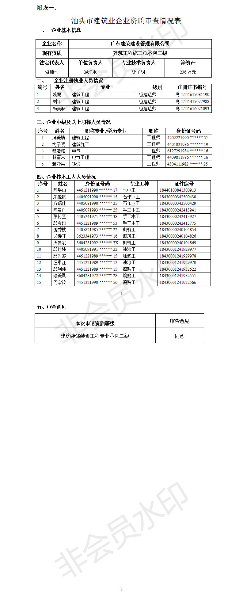 瀏覽次數(shù):4876按照《中華人民共和國行政許可法》規(guī)定以及《建筑業(yè)企業(yè)資質(zhì)管理規(guī)定》(住房城鄉(xiāng)建設(shè)部第22號(hào)令)、(住房城鄉(xiāng)建設(shè)部關(guān)于印發(fā)《建筑業(yè)企業(yè)資質(zhì)標(biāo)準(zhǔn)》的通知)(建市[2014]159號(hào))的要求,我局對(duì)近期申請(qǐng)建筑業(yè)企業(yè)資質(zhì)的廣東建榮建設(shè)管理有限公司申報(bào)材料進(jìn)行了審查,現(xiàn)將審查意見予以公示(見附表) 。