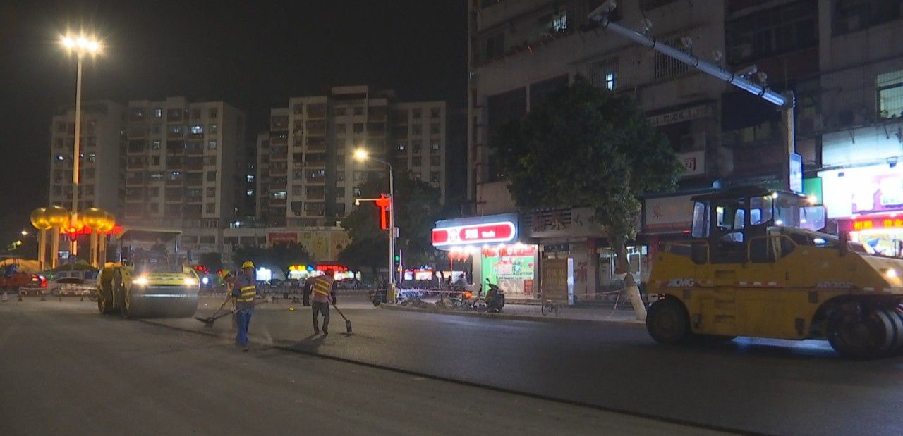 連日來(lái),在中山路金鳳壇路段,施工人員加班加點(diǎn)鋪設(shè)路面瀝青,經(jīng)常施工到凌晨。