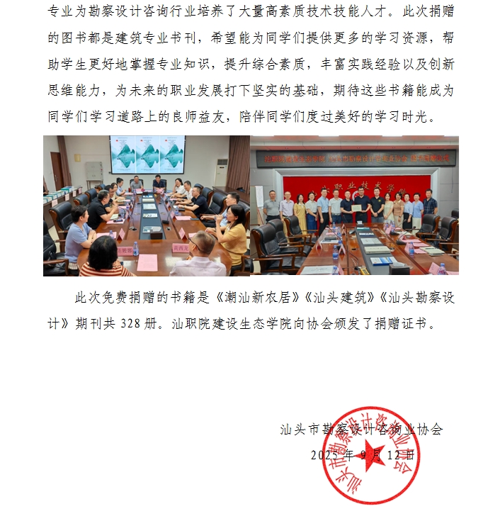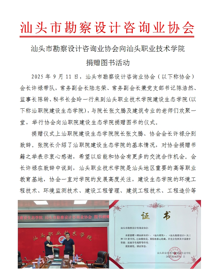 汕頭市勘察設(shè)計咨詢業(yè)協(xié)會向汕頭職業(yè)技術(shù)學(xué)院捐贈圖書活動