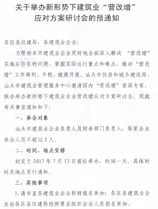 關于舉辦新形勢下建筑業(yè)“營改增”應對方案研討會的預通知