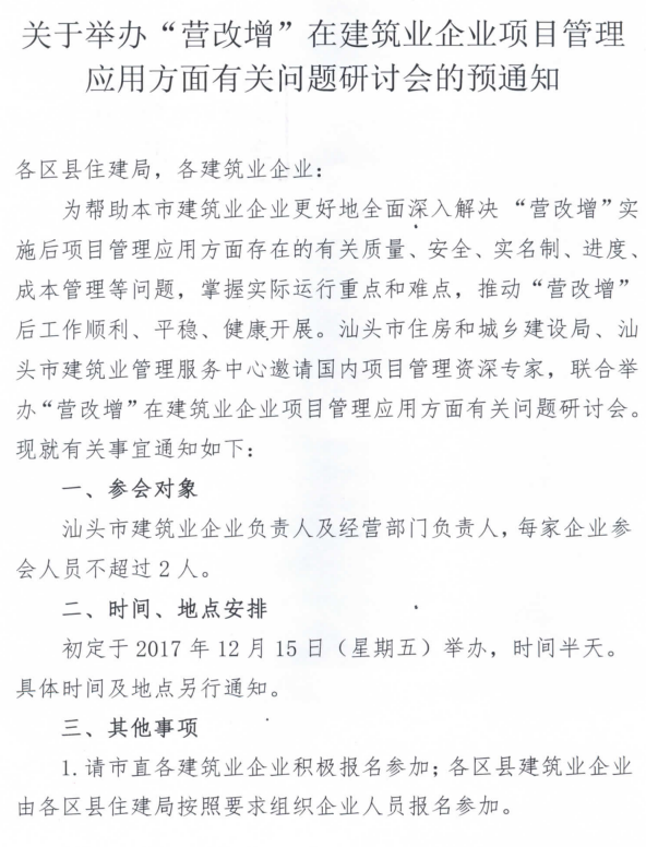 關(guān)于舉辦“營改增”在建筑業(yè)企業(yè)項(xiàng)目管理應(yīng)用方面有關(guān)問題研討會的預(yù)通知